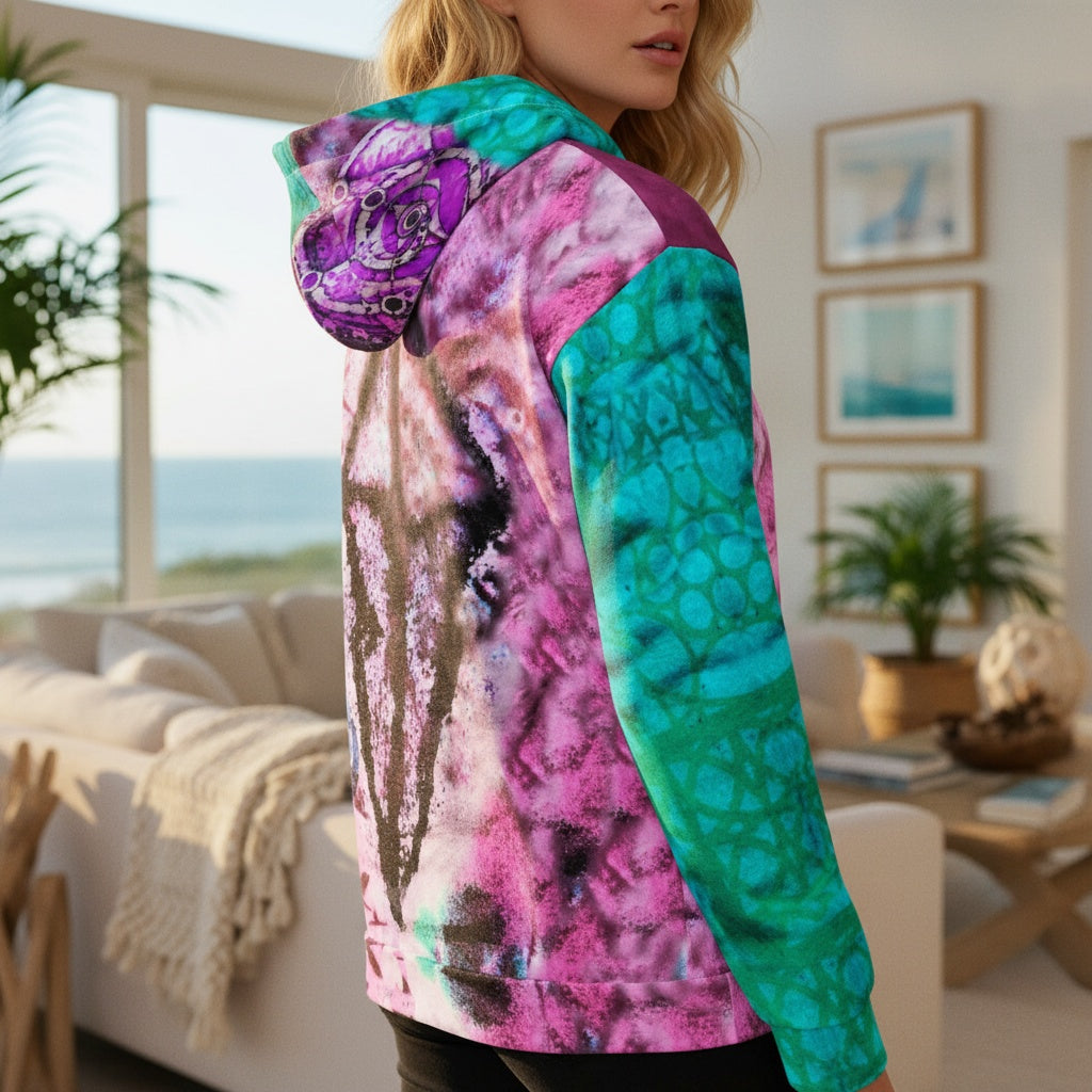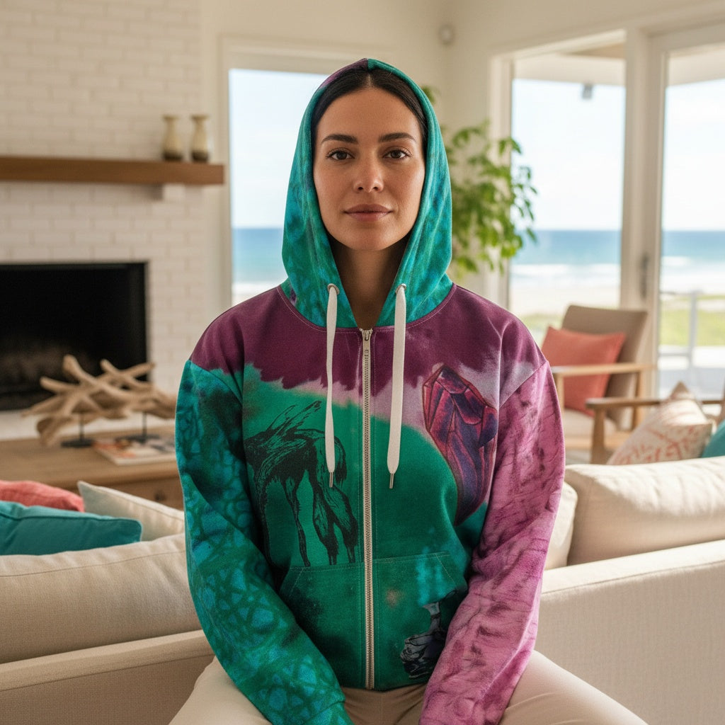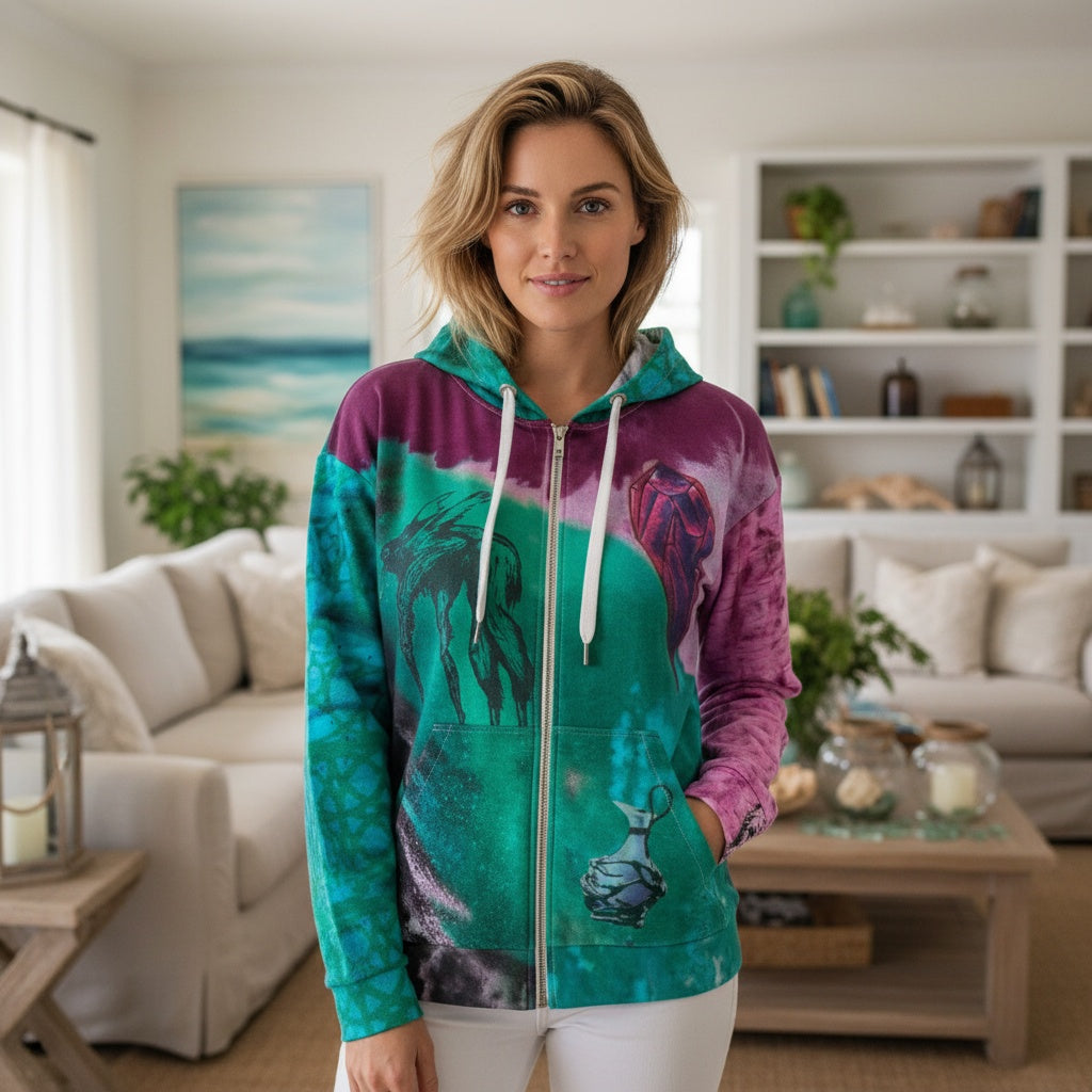 To add a unique touch, this hoodie features the beautiful watercolor Drk Crystal series graphic art, which enhances its aesthetic appeal and makes it a standout piece in your wardrobe.
