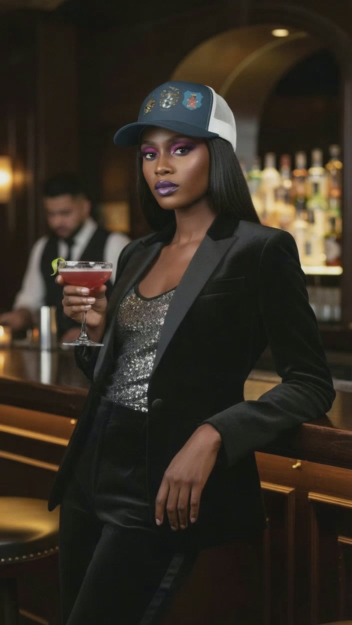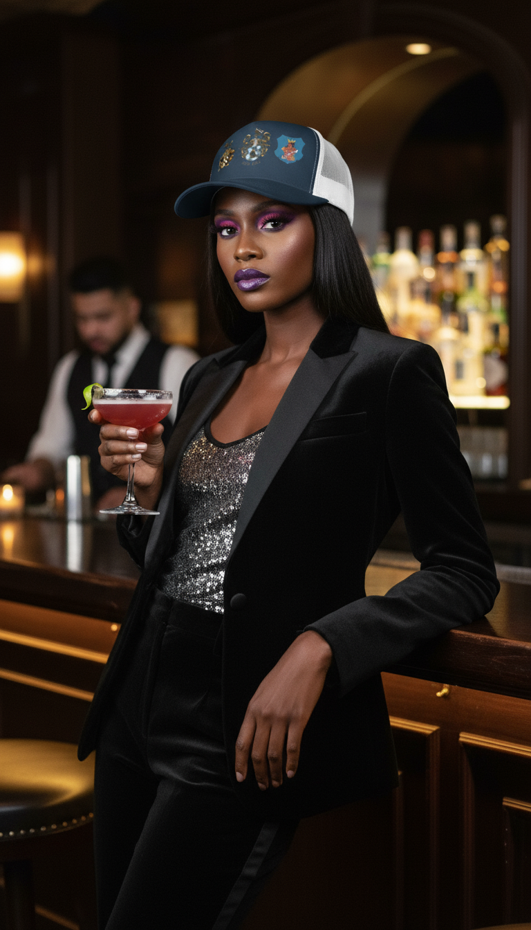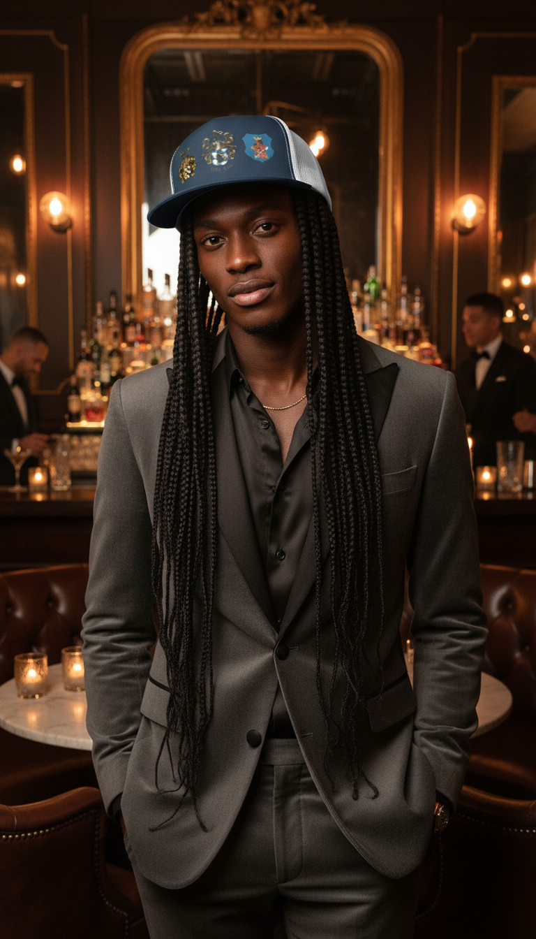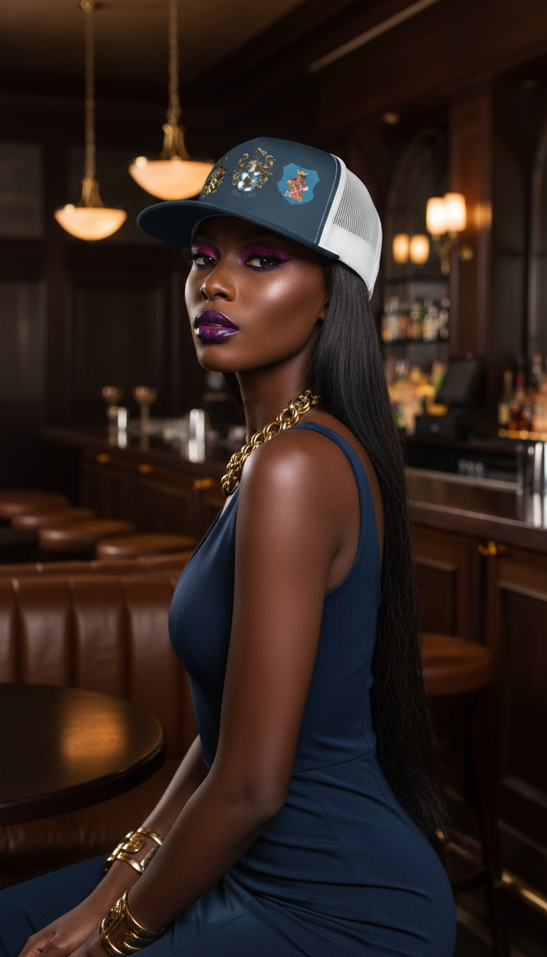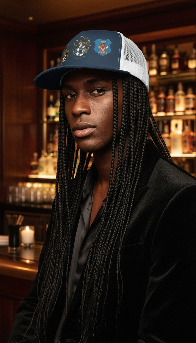 This hat honors a forgotten brilliance—the legacy of the Moors who brought Europe its rhythm, intellect, and elegance. Embellished with a Moorish-European family crest, it symbolizes the fusion of art, science, mathematics, and music that once defined an age of enlightenment. The design features geometric harmony inspired by Andalusian architecture, metallic filigree that mirrors ancient craftsmanship, and deep hues of gold, indigo, and obsidian reflecting nobility and mystery.